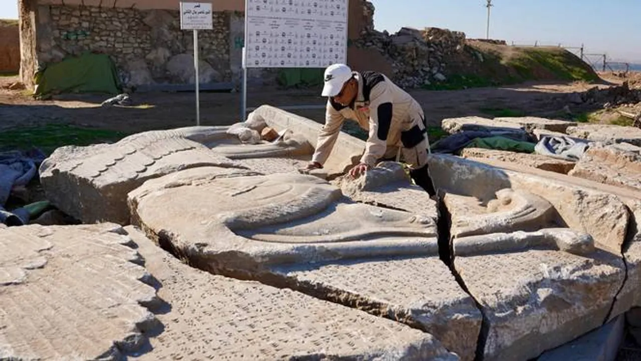 لرغونپوهان په ډیر احتیاط سره د هغو مجسمو، مجسمو او سینګار شویو تختو بیا راټولونه کوي چې د افسانوي مخلوقاتو انځور ورکوي، کوم چې نږدې ۳,۰۰۰ کاله دمخه د آشوري پاچا دوهم اشورناسیرپال ماڼۍ ته ښکلا ورکړې وه.